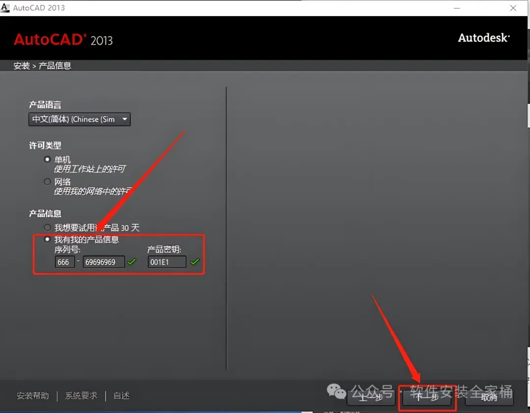 8.输入序列号:666-69696969,密钥:001E1,输入好后点击【下一步】。温馨提示:序列号和密钥就用教程中的