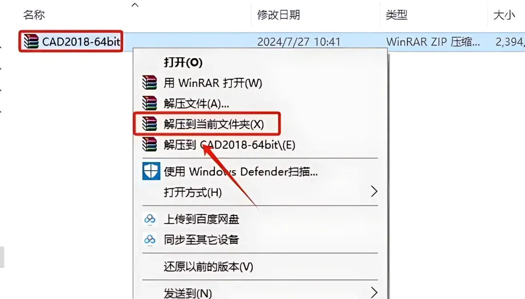 1.打开下载好的CAD安装包,然后鼠标右击压缩包,选择【解压到当前文件夹】。