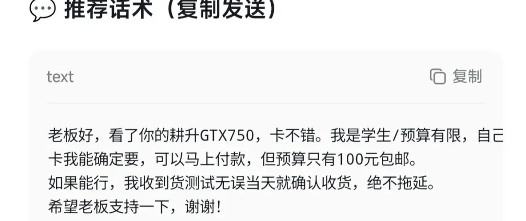 1. 把卖家的描述截图发给AI,让它帮你找“坏卡”“维修”“矿卡”这些关键词