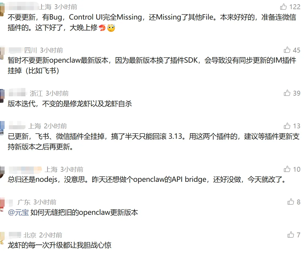 最先炸的不是模型,也不是界面小细节,而是插件。fei书、微信这些大家真正在用的 IM 插件,成了重灾区:有人装不上,有人一升级就全挂,还有人折腾半天只能退回 3.13。再加上有人直接遇到 Control UI missing、文件缺失,这种体验就很真实了——发布稿里叫“换血”,落到用户手里就是“今晚别睡了”。