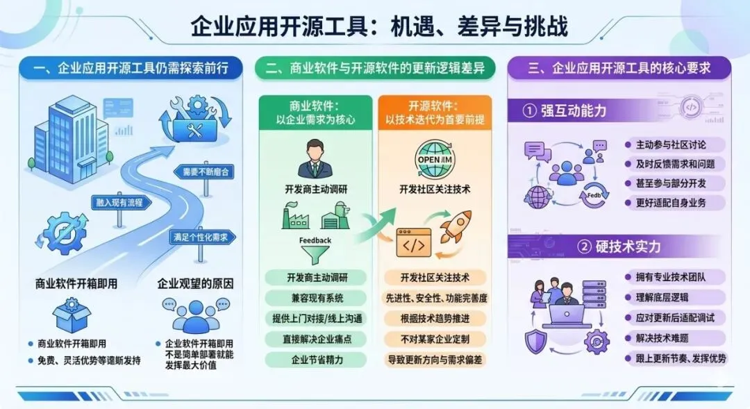 openclaw一次升级过程的思考如今开源工具凭借免费、灵活的优势,逐渐走进企业视野,但对多数企业而言,真正熟练运用开源工具还有一段路要走。不像商业软件开箱即用、适配成熟,开源工具在融入企业现有业务流程、满足个性化需求等方面,还需要企业不断磨合调整,并非简单部署就能发挥最大价值,这也是很多企业观望或使用不深入的核心原因。商业软件的更新完全以企业需求为核心导向。开发商会主动调研企业的实际使用场景、业务痛点,更新时优先考虑与企业现有系统的兼容性,还会通过上门对接、线上沟通等方式,紧密听取企业意见,确保更新后的功能能直接解决企业问题,不用企业额外花费过多精力适配。而开源软件的更新则以技术迭代为首要前提。开发社区更关注技术的先进性、安全性和功能完善度,会根据技术发展趋势推进更新,不会专门针对某一家企业的需求做定制化调整。这种更新模式让开源软件始终保持技术领先,但也导致其更新方向可能与企业实际需求存在偏差。正因为开源软件的更新逻辑,企业要想用好转开源工具,必须满足两个关键条件。一是强互动能力,企业需要主动参与开源社区的讨论,及时反馈自身需求和使用问题,甚至参与部分开发工作,才能让开源工具更好地适配自身业务;二是硬技术实力,企业需要有专业的技术团队,能够理解开源软件的底层逻辑,应对更新后的适配、调试工作,解决使用过程中出现的技术难题,否则很难跟上开源软件的更新节奏,也无法充分发挥其优势。