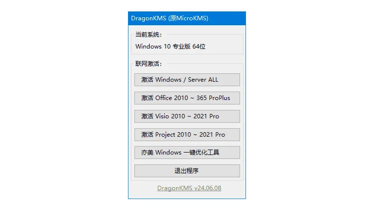 用户核心痛点: 激活门槛高:微软官网激活流程繁琐,零售密钥价格贵(Win11专业版约1000元),普通用户难以承担。 操作复杂:手动配置KMS服务器需命令行,步骤多易出错,非技术用户无法独立完成。 续期麻烦:KMS激活默认180天有效期,到期需手动续期,易遗忘导致功能受限。 批量部署难:企业/装机店需激活多台设备,传统工具效率低,缺乏批量管理能力。 安全风险:部分激活工具捆绑恶意软件,或被安全软件误杀,影响使用体验。 产品起源与定位: 原名MicroKMS神龙版,后更名为DragonKMS,是国内开发者基于微软KMS协议开发的第三方激活工具,定位“轻量+易用+免费”,覆盖个人、装机店、小型企业场景,全球累计用户超千万。 技术特点:体积仅2MB左右,绿色便携无需安装,支持离线激活,适配Win7至Win11及Server全系,同时兼容Office 2010-2024/365、Visio、Project等办公软件。 核心优势:一键激活+自动续期+批量部署,无需专业知识即可完成激活,降低用户使用门槛。