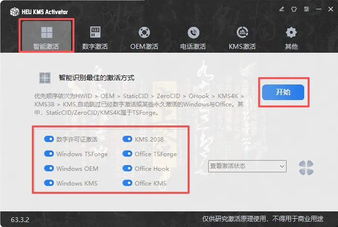 4.进入软件后,各种激活模式,如果是新电脑安装了window10/11系统,或者安装了office软件,选择智能激活,再点击开始即可