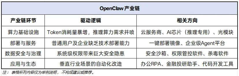 软件与服务(安全):这是当前最迫切的需求。国联民生证券研报表示,企业级落地需跨越安全沙箱门槛,围绕 OpenClaw的权限管理、恶意代码防护、企业级部署方案将拉开厂商利润差距。