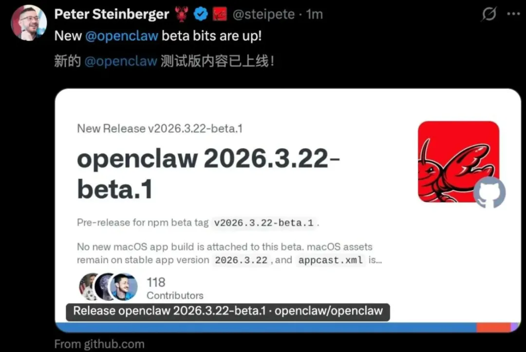 答案终于揭晓!3月22日,OpenClaw创始人Peter Steinberger正式官宣,2026.3.22-beta.1预览版重磅上线。
