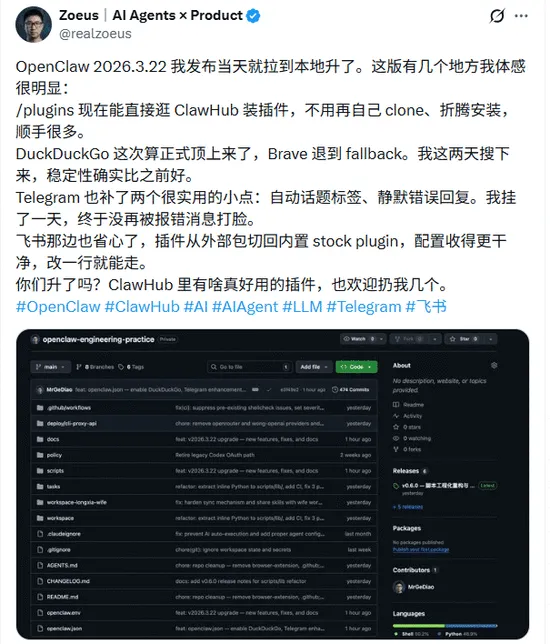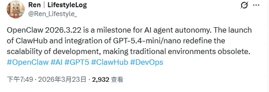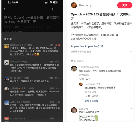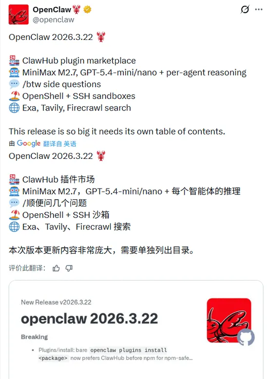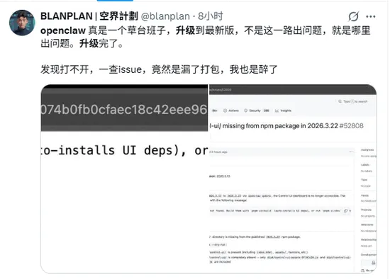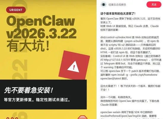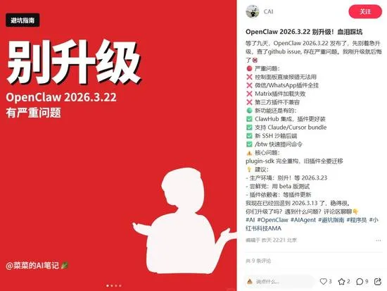 停更9天后OpenClaw迎来3.22大更新,但我们劝普通用户千万别急着升级出品 | 网易智能作者 | 小小编辑 | 王凤枝沉寂9天之后,OpenClaw正式推送了号称里程碑的3.22大版本更新,但我们给普通用户的核心建议是,千万别急着点升级。3月22日,项目创始人彼得·斯坦伯格(Peter Steinberger)亲自推动这次重大更新,从底层架构到模型适配进行了一次全面翻新。有社区成员将OpenClaw3.22版本视为AI智能体自主能力发展中的一个里程碑。他认为,插件市场ClawHub的推出以及GPT-5.4-mini和nano的集成,正在重新定义开发的可扩展性,让传统环境变得过时。然而,这个里程碑发布后不到一天就遭遇了现实的毒打。更新后,大量用户在GitHub和X上反馈控制台打不开,熟悉的“Control UI assets not found”报错卷土重来,有人花了半小时才修复,直言这种事本不该发生,更有人表示对不懂编程的人来说,这种问题简直致命。实际上,这类升级事故在OpenClaw圈子里已成传统。1月底那个让无数人对着白屏抓狂的相同报错,老用户们至今记忆犹新。这次3.22版本虽然修复了大量底层漏洞,但在插件兼容性上依然给开发者挖了新坑,由于API路径重构,一大批第三方插件直接瘫痪。在小红书上,网友的吐槽更是比比皆是。有人发帖抱怨等了九天终于等到新版,结果升级完就后悔了,控制面板直接报错没法用,微信和WhatsApp插件全挂,Matrix插件也加载失败,很多第三方插件都不兼容。最后只能连夜回退到2026.3.13版本才勉强恢复正常。还有用户专门发帖提醒,如果你现在在用微信通道,绝对不要点更新,实测升级后微信插件会直接挂掉,只能靠回退版本恢复。有人忍不住抱怨,OpenClaw已经不是原来的小众软件了,现在这么多人用,官方发版的时候是不是应该谨慎一些。但极其魔幻的是,一边是普通用户在吐槽,另一边却有极客玩家在发布后仅半小时就完成了更新,在一台MacMini上流畅地跑着5个智能体,分别负责战略、工程、质量保证、内容和监控。这个让普通人抓狂、让极客狂欢的3.22版本,到底在底层动了什么大手术?ClawHub上线从“零散插件”到“标准化生态”这次最核心的变化,是ClawHub插件市场正式成为默认的插件安装源。以前,OpenClaw的插件主要依赖npm,质量参差不齐。现在,ClawHub提供了官方渠道,开发者可以上架技能,用户能直接搜索、安装、更新,不用再自己克隆仓库或折腾安装。更重要的是,插件安装的优先级变了,ClawHub优先,npm兜底。官方给出的理由是ClawHub的审核更严,能有效减少恶意代码注入风险。这一变动让2月初就曾引爆安全社区的供应链投毒担忧卷土重来。当时许多白帽黑客指出,ClawHub下载计数器可被伪造,恶意技能极易在隔离虚拟机中执行。3.22版本将其设为默认源,无疑放大了这一争议。不过,有网友认为,ClawHub的推出是改变OpenClaw发展轨迹的关键一步。以前扩展功能意味着要手动改配置文件,还要担心更新后配置失效,现在有了插件商店,第三方开发者不用动核心代码就能交付功能,AI工具的分发模式就此发生了转变。另一位长期关注AI工具生态的开发者看得更远。对他来说,要弥补与某个具体功能工具的差距并不难,但要构建一个像ClawHub这样有第三方开发者支撑的插件生态,难度就完全不同了。原生集成某个通讯软件是一回事,让整个社区帮你丰富功能是另一回事。如果ClawHub能获得广泛采用,OpenClaw就不只是一个临时方案,而会变成基础设施层。与此同时,这次更新还新增了Claude、Codex和Cursor三大开发工具插件包的自动发现和安装支持,外部插件的Skills可以直接映射进OpenClaw体系。这意味着OpenClaw正在从一个封闭的工具框架,变成一个能吸纳外部生态的开放平台。模型全面换血GPT-5.4全家桶与MiniMax M2.7模型支持方面,OpenClaw这次也跟得很快。新版本原生支持GPT-5.4、GPT-5.4-mini和GPT-5.4-nano全系列,同时引入了单智能体推理(per-agent reasoning),即每个智能体可以独立配置推理逻辑,不再共用全局设定。MiniMax也从M2.5升级到M2.7,为中文语境下的任务提供了更强支持。有技术博主专门拆解了这项能力带来的实际价值。他认为,大多数AI智能体框架都是让所有智能体共用同一套模型,但OpenClaw这次允许给不同智能体分配不同级别的推理能力,简单任务用低成本模型跑,只有关键节点才动用复杂模型。这种设计能有效防止API成本随着规模扩大而失控。他还给出了一个很具体的用法,把低复杂度的工具调用交给GPT-5.4-nano,把规划层的任务留给MiniMax M2.7,这样既压低了推理成本,又不影响关键节点的输出质量。在Mac Mini上跑着5个智能体的那位用户也印证了这一点。他说每个智能体独立推理确实是这次更新的亮点,因为并不是所有任务都需要顶级模型的那种思考深度,让智能体根据任务复杂度自己调整认知能力,既能省钱又不降质量。安全与执行OpenShell与SSH沙箱一口气修了十多个漏洞这次更新在安全方面的投入,比表面上看到的要多得多。3.22版本引入了OpenShell与SSH沙箱架构,开发者无需依赖沉重的Docker环境,而是通过受保护的密钥与证书,在轻量化的SSH沙箱中执行任务。这既解决了AI智能体执行代码时的安全疑虑,也大幅缩短了智能体的冷启动时间。但更值得关注的是,这次一口气修了十多项安全漏洞。Windows SMB凭证泄露是其中最严重的一个,攻击者可以通过构造特殊的file://或UNC路径,在媒体加载环节触发Windows自动发起SMB认证,把用户的登录凭证送出