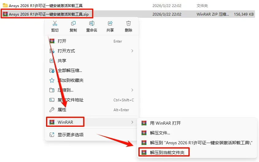 1.选中下载的压缩包,然后鼠标右键选择选择“解压到当前文件夹”(没有解压选项点这里)