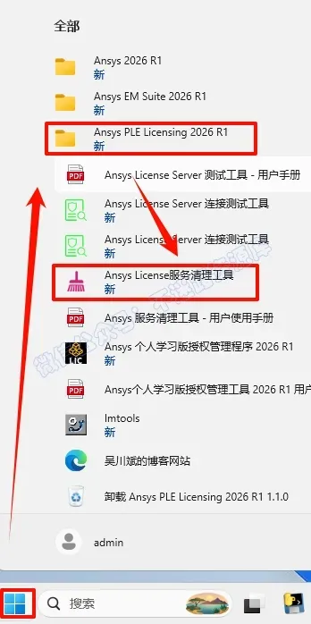 8.如果之前有安装了旧版本的Ansys授权管理服务,点击“开始“菜单栏,点击展开“Ansys PLE Licensing“,点击打开“Ansys服务清理工具“,可以使用这个工具卸载清理授权管理服务