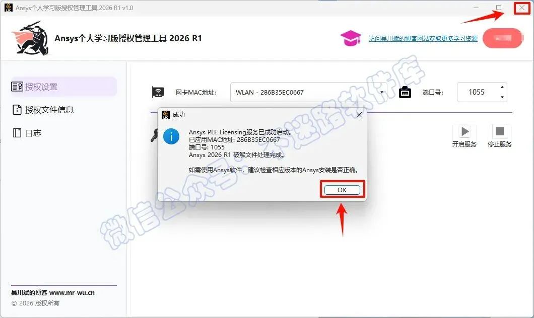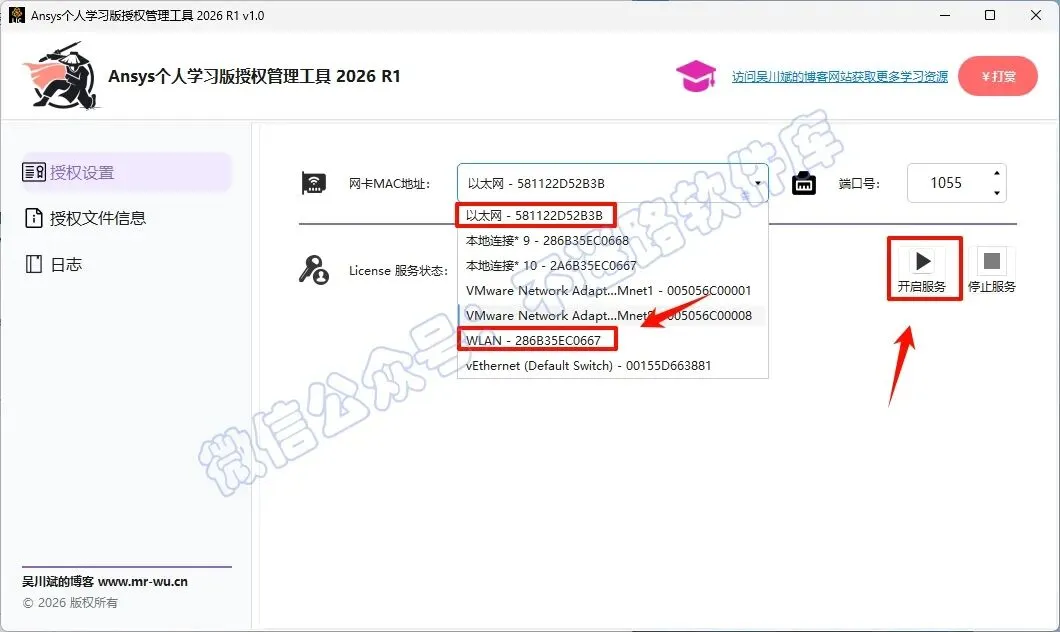 温馨提示:请选择一个有效的物理网卡(如有线网卡或无线网卡)的MAC地址。避免选择名称中带有 “Bluetooth”, “Virtual”, “VMware” 等字样的虚拟网卡。如果不确定,可以逐个尝试。通常情况下,保留默认的端口号即可。 如果默认端口(如1055)已被其他程序占用,您可以自行指定一个未被使用的端口(例如 1056等)。如果开启服务失败,往往换一个端口号就可以了的。