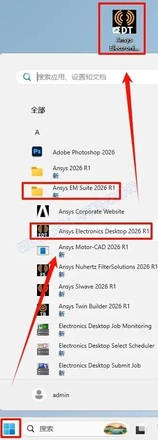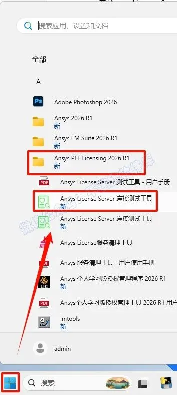 13.点击“开始“菜单栏,点击展开“Ansys PLE Licensing“,点击打开“Ansys License Server连接测试工具“