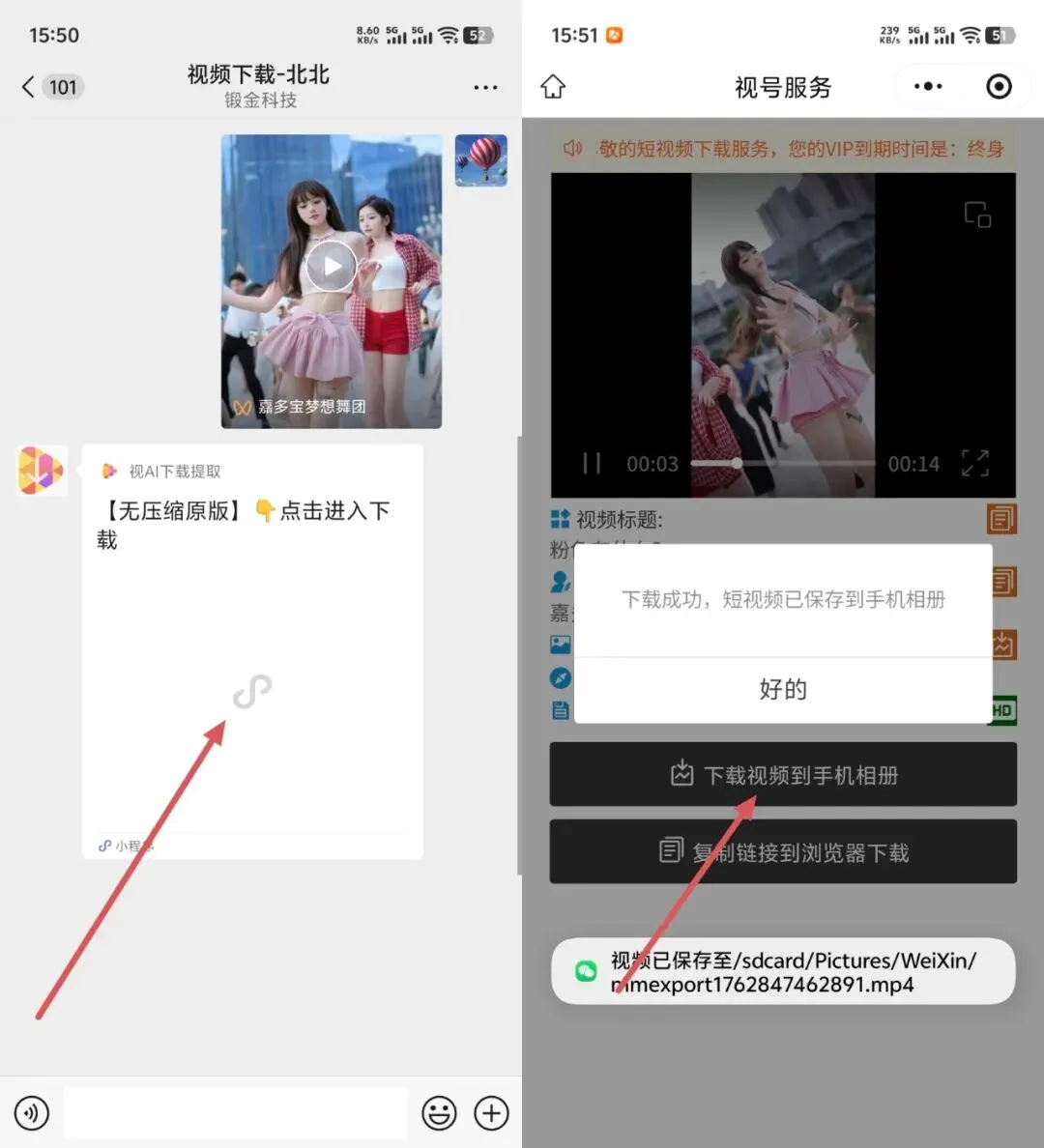 ② 视频下载客服机器人会自动解析并返回下载小程序,进入小程序就可以一键下载到手机相册了!