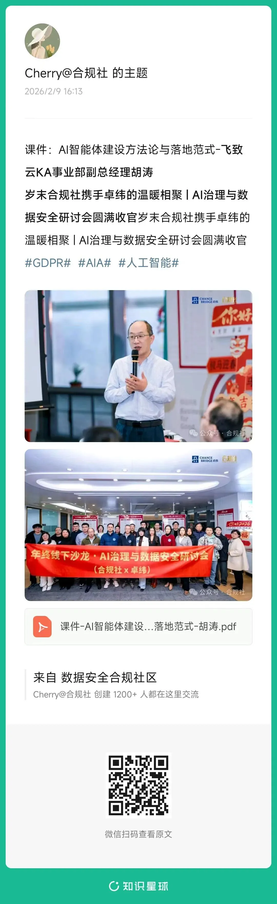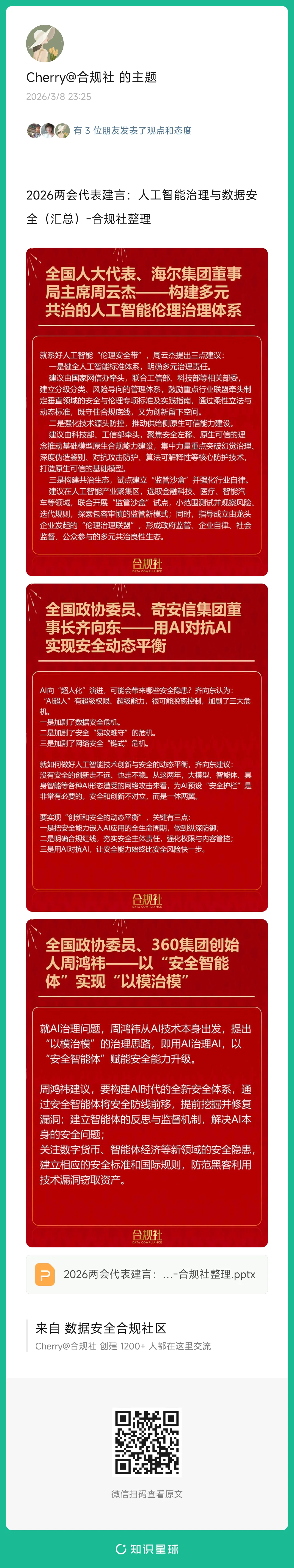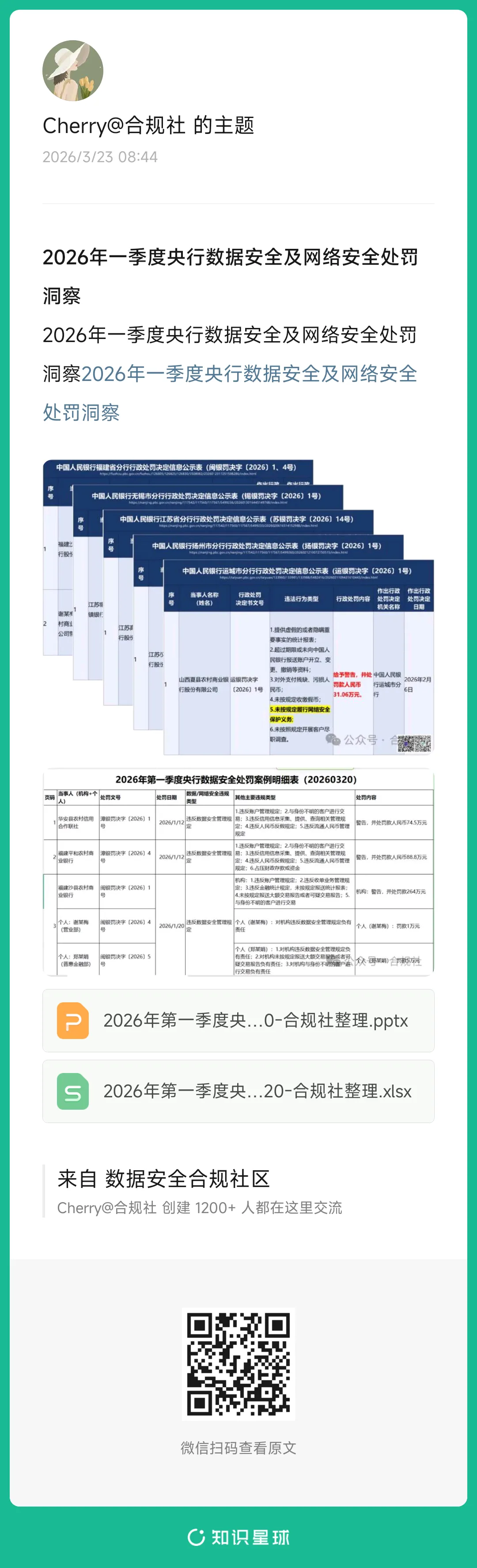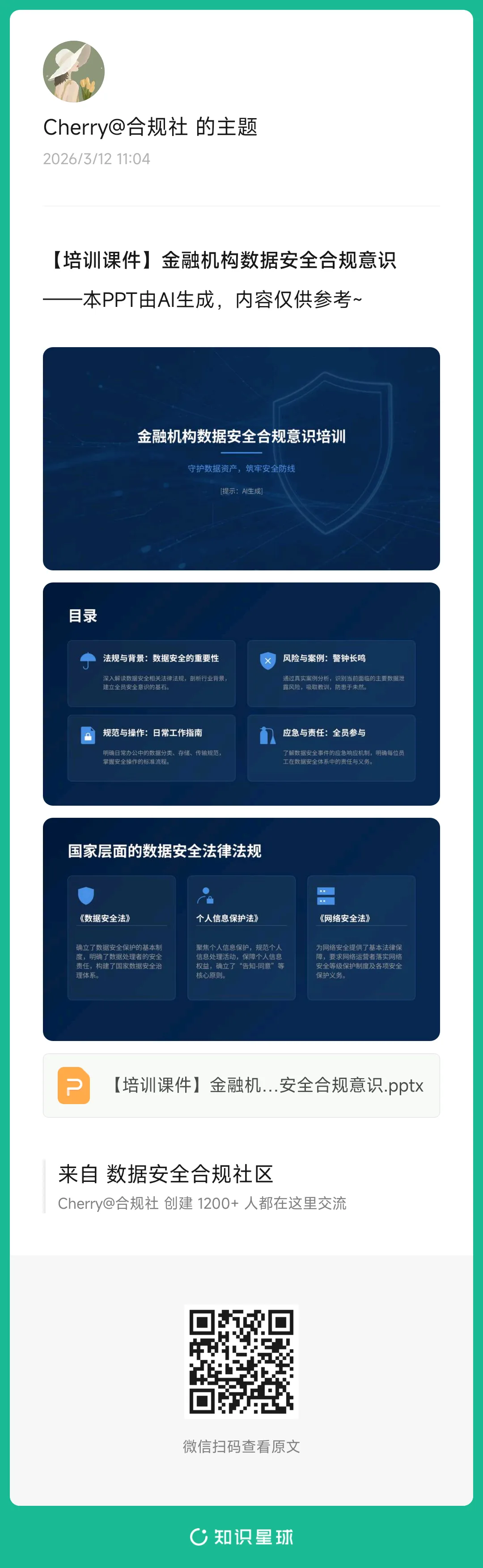 知识星球2-3月热门下载 | 14份可编辑PPT、评估报告模板等探寻合规之道,共筑数据保障之堡。专注为数据安全管理者、技术专家、隐私法务、律师等专业人士打造的知识共享与交流平台。点击 "合规社" > 点击右上角“···” > 设为星标⭐📖 推荐阅读:知识星球往期精选知识星球三月资料更新&精华帖 (可下载)四月这些干货你下载了吗?星球用户激励放送 | 福利实用干货、速来围观 | 合规社知识星球社区热帖(5-6月)13个精华主题 | 合规社知识星球社区热帖(7-8月)这些课件可下载!知识星球9月热帖&用户福利发放!星球社区10-11月热帖,会员不限下载!星球会员已1126位!超值宝藏社区,海量干货尽在这里 →数据安全合规社区:500天,再出发!领导转了合规社的汇编,太全了,打开5s就决定付费支持 | 星球12月热帖星球年度十大热门主题揭晓&1月下载榜单荣誉榜 | 合规社2025年度获奖名单