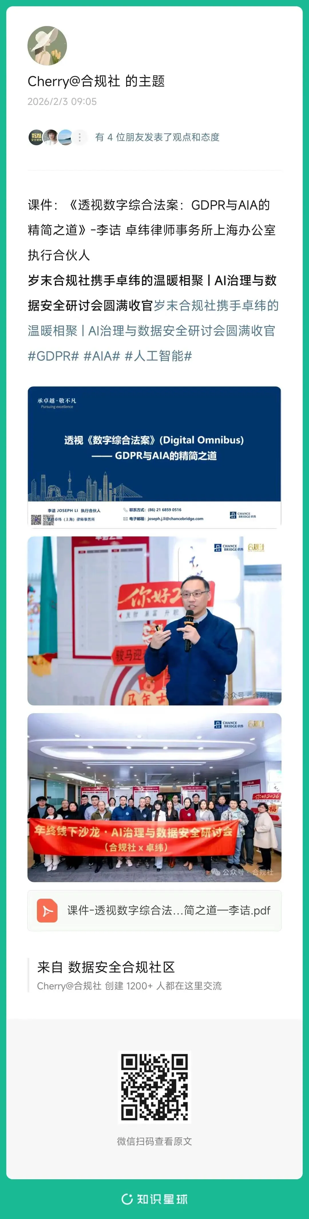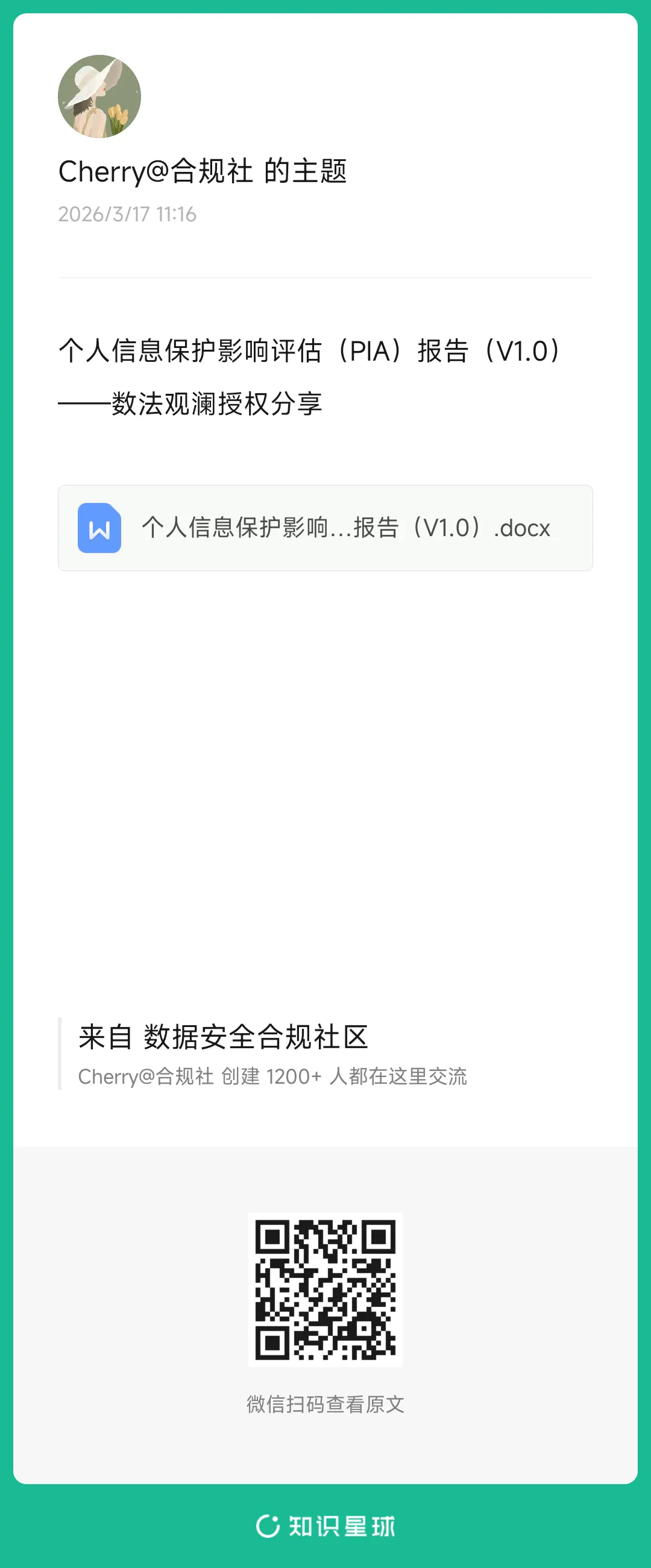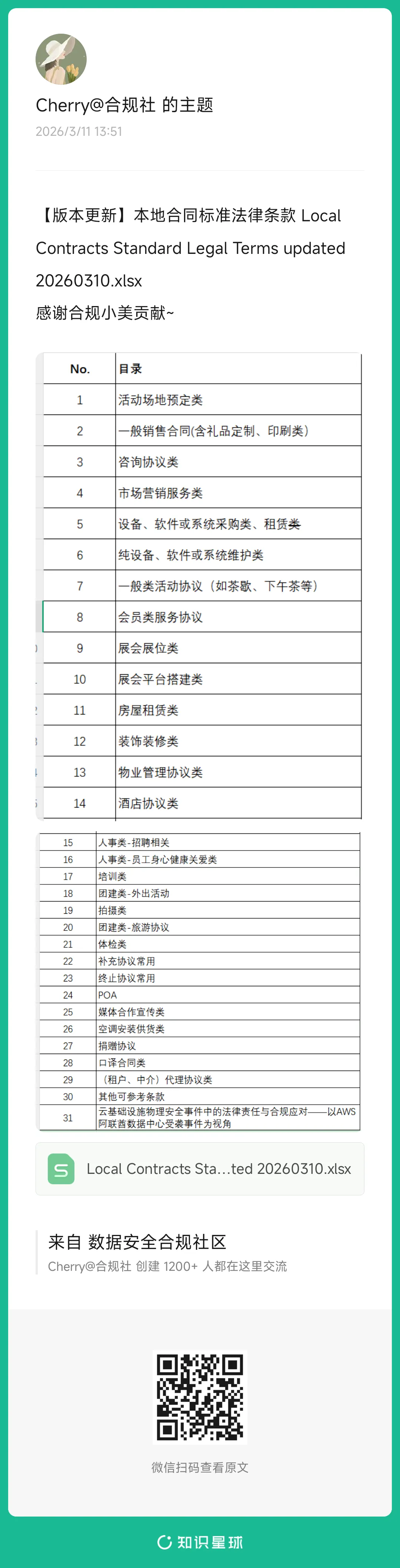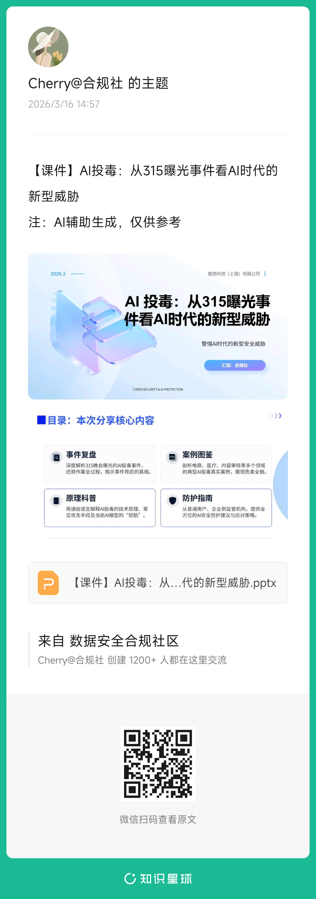 知识星球2-3月热门下载 | 14份可编辑PPT、评估报告模板等探寻合规之道,共筑数据保障之堡。专注为数据安全管理者、技术专家、隐私法务、律师等专业人士打造的知识共享与交流平台。点击 "合规社" > 点击右上角“···” > 设为星标⭐📖 推荐阅读:知识星球往期精选知识星球三月资料更新&精华帖 (可下载)四月这些干货你下载了吗?星球用户激励放送 | 福利实用干货、速来围观 | 合规社知识星球社区热帖(5-6月)13个精华主题 | 合规社知识星球社区热帖(7-8月)这些课件可下载!知识星球9月热帖&用户福利发放!星球社区10-11月热帖,会员不限下载!星球会员已1126位!超值宝藏社区,海量干货尽在这里 →数据安全合规社区:500天,再出发!领导转了合规社的汇编,太全了,打开5s就决定付费支持 | 星球12月热帖星球年度十大热门主题揭晓&1月下载榜单荣誉榜 | 合规社2025年度获奖名单