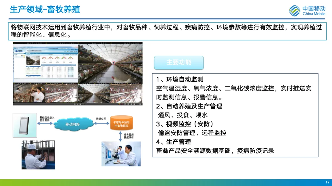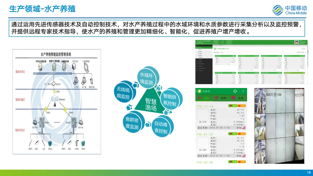 :在养殖场对环境参数(温湿度、有害气体)进行监测预警,实现自动喂水、喂料、通风,并结合视频监控进行安防与远程管理。通过个体标识(如耳标),建立畜禽电子档案,实现精准饲喂与疫病防疫管理。 - 水产养殖