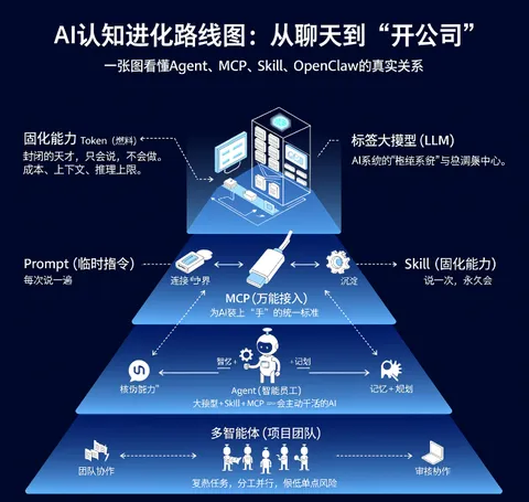 刚入门:先把Prompt练熟,学会"精准点单" 有一定基础:开始沉淀Skill,建自己的能力库 开发者:接MCP,让AI真正能操作工具和系统 想做自动化系统:上多智能体架构,用OpenClaw编排整个流程