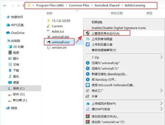 可以复制此路径【C:\Program Files (x86)\Common Files\Autodesk Shared\AdskLicensing】粘贴到我的电脑上方的地址栏然后按回车键打开,选中下图所示文件,鼠标右键选择【以管理员身份运行】,运行完后可以重新打开安装程序进行安装。