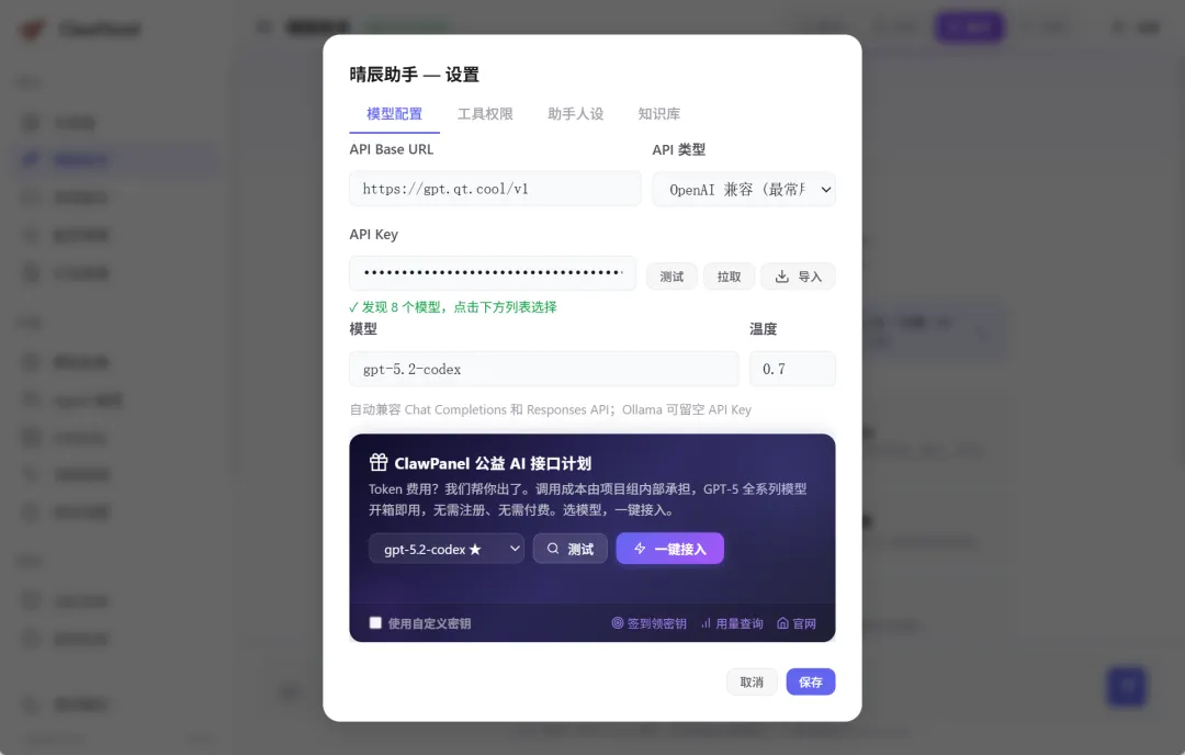 AI 助手(全新·重磅) — 内置独立 AI 助手,4 种操作模式 + 8 大工具 + 交互式问答。 图片识别 — 粘贴截图或拖拽图片,AI 自动识别分析,支持多模态图文混排对话 仪表盘 — 系统概览,服务状态实时监控,快捷操作 服务管理 — OpenClaw 启停控制、版本检测与一键升级、Gateway 安装/卸载、配置备份与还原 模型配置 — 多服务商管理、模型增删改查、批量连通性测试、延迟检测、拖拽排序、自动保存+撤销 网关配置 — 端口、访问权限(本机/局域网)、认证 Token、Tailscale 组网 消息渠道 — 统一管理 Telegram、Discord、飞书、钉钉、QQ 等消息接入,支持同平台多 Agent 绑定 通信与自动化 — 消息设置、广播策略、斜杠命令、Webhook、执行审批转发等高级配置 使用情况 — Token 用量、API 费用、热门模型/服务商/工具排行、每日用量图表 Agent 管理 — Agent 增删改查、身份编辑、模型配置、工作区管理 聊天 — 流式响应、Markdown 渲染、会话管理、/fast /think /verbose /reasoning 命令、Compaction 状态指示 定时任务 — Cron 定时执行,支持多渠道投递 日志查看 — 多日志源实时查看与关键词搜索 记忆管理 — 记忆文件查看/编辑、分类管理、ZIP 导出、Agent 切换 晴辰云 AI 接口 — 官方 AI 服务,签到送额度、充值最低 3 折消耗、未消耗包退 扩展工具 — cftunnel 内网穿透管理、ClawApp 状态监控 关于 — 版本信息、社群入口、相关项目链接、一键升级