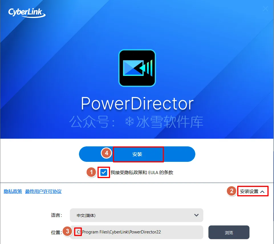 3.安装设置:①勾选【我接受隐私则很难唱歌……】②点击【安装设置】③修改路径地址中的首字符C可更改安装位置(如:将C改为D软件将安装到D盘)④点击【安装】。