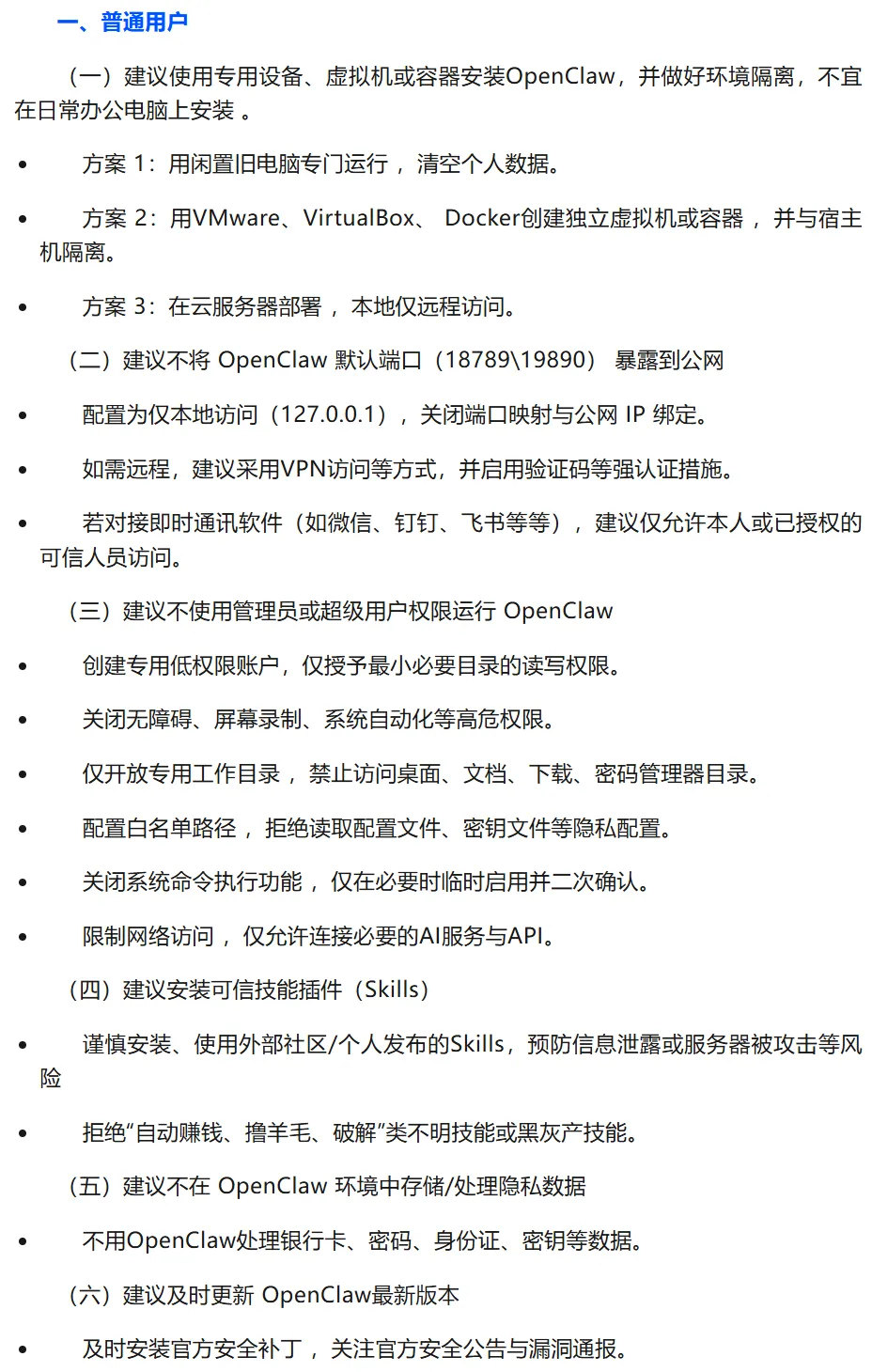 其中,对于普通用户的建议包括:使用专用设备、虚拟机或容器安装OpenClaw,并做好环境隔离,不宜在日常办公电脑上安装;不使用管理员或超级用户权限运行OpenClaw;不在OpenClaw环境中存储、处理隐私数据;及时更新OpenClaw最新版本等。