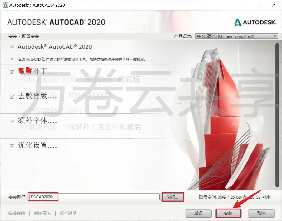4.点击→浏览可更改安装位置(建议不要安装在C盘,可以在D盘或其它磁盘下新建一个“CAD2020”文件夹,注:安装路径中不要有中文),点击→安装