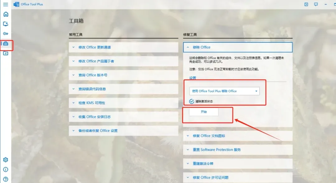 2、在打开的界面里找到移除office的选项,然后点开始,不然电脑有残留的话装不上