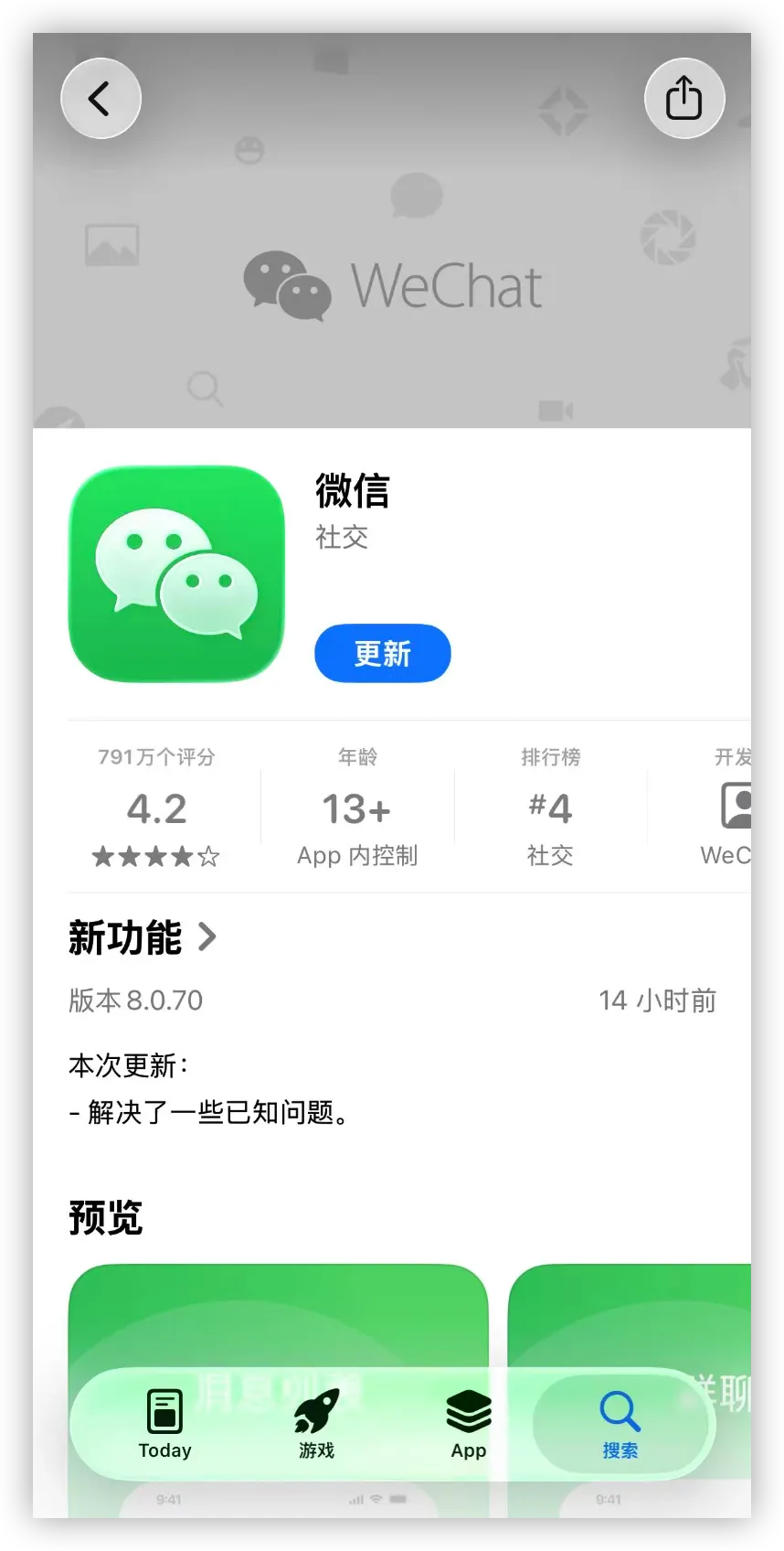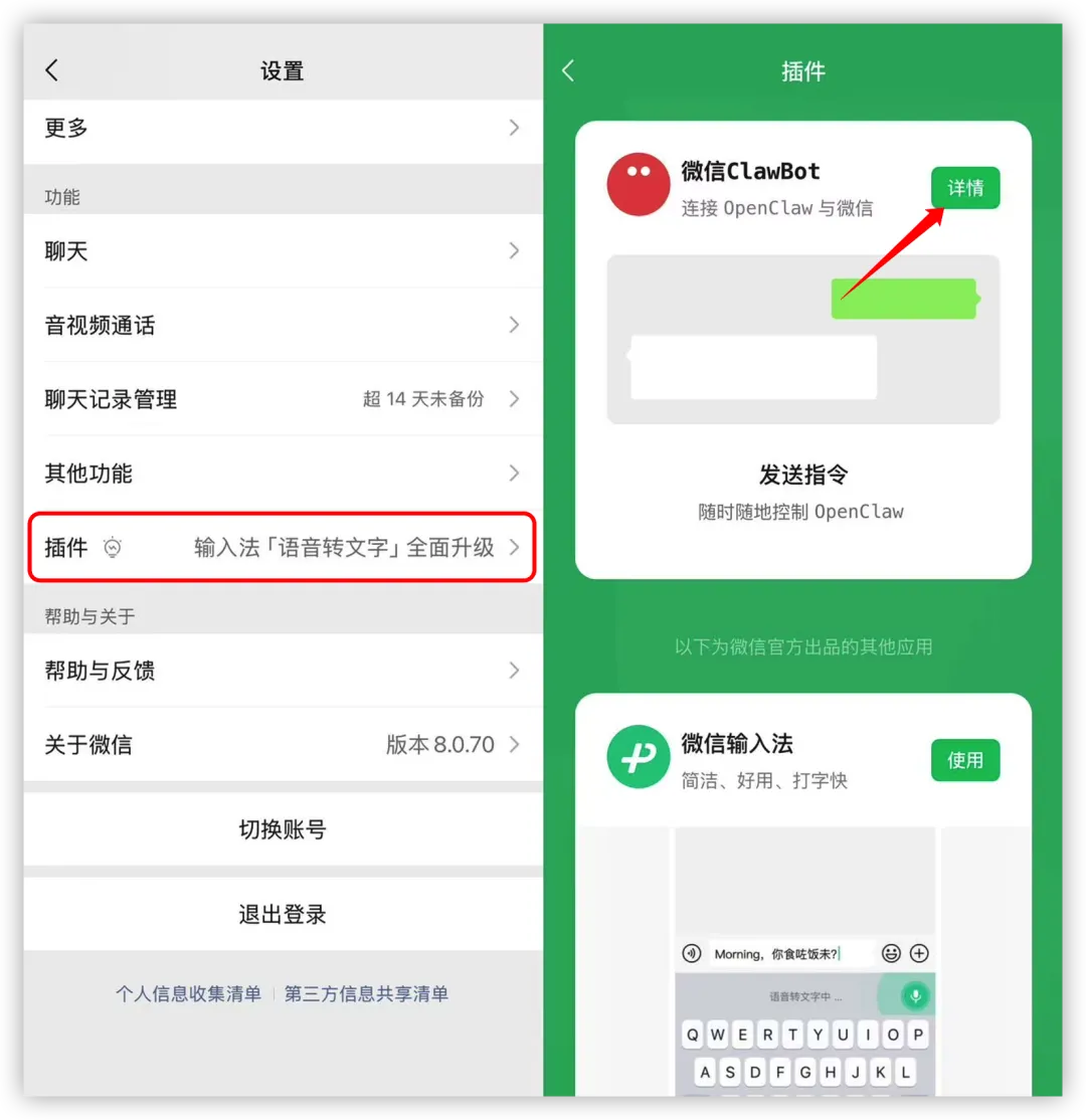 iOS 微信更新,新插件来了!先是为 PC 端微信重塑了界面设计,随后又开启了 iOS 微信 8.0.70 版本的内测计划。现在,iOS 微信 8.0.70 正式版终于来了。但实际体验后小果发现,iOS 微信 8.0.70 版本中,看点还是非常多的。这段时间,OpenClaw(龙虾)一直是科技圈的热词。而微信这边显然也没闲着,龙虾相关的新项目也是一个接着一个。前段时间,官方正式宣布将龙虾工具 QClaw 接入微信本体。而在最新版本中,微信直接推出了一个更加简便的官方插件。将 iOS 微信升级至最新版本,就能在「设置」—「插件」中找到这个新插件了。要知道上一个全民级别的微信官方插件,还要追溯到微信输入法。而对于「养虾户」们来说,微信的新插件也是相当利好。已运行 OpenClaw 的设备,可以通过复制链接安装插件。对于普通用户来说,则可以直接通过扫一扫,将微信绑定 QClaw。验证并绑定后,微信好友列表中就会多出一个名叫「微信 ClawBot」的小机器人。与此前的元宝一样,「微信 ClawBot」也可以设置免打扰和指定。这样一来,就可以快速通过微信与龙虾交谈、或下达指令了。QClaw 每天会免费赠送 4000 万个 Token。经过小果测试,在执行简单命令时,QClaw 消耗的 Token 并不大。但如果涉及「盘点」和「统计」这类操作时,Token 的消耗就会暴涨至 10 万级。除了龙虾插件之外,iOS 微信 8.0.70 版本中,基本就是一些基础的社交功能了。需要注意的是,除了龙虾插件之外,以上提到的其他功能均处于测试阶段。以上,就是关于 iOS 微信 8.0.70 版本的主要内容了。戳这里,不迷路