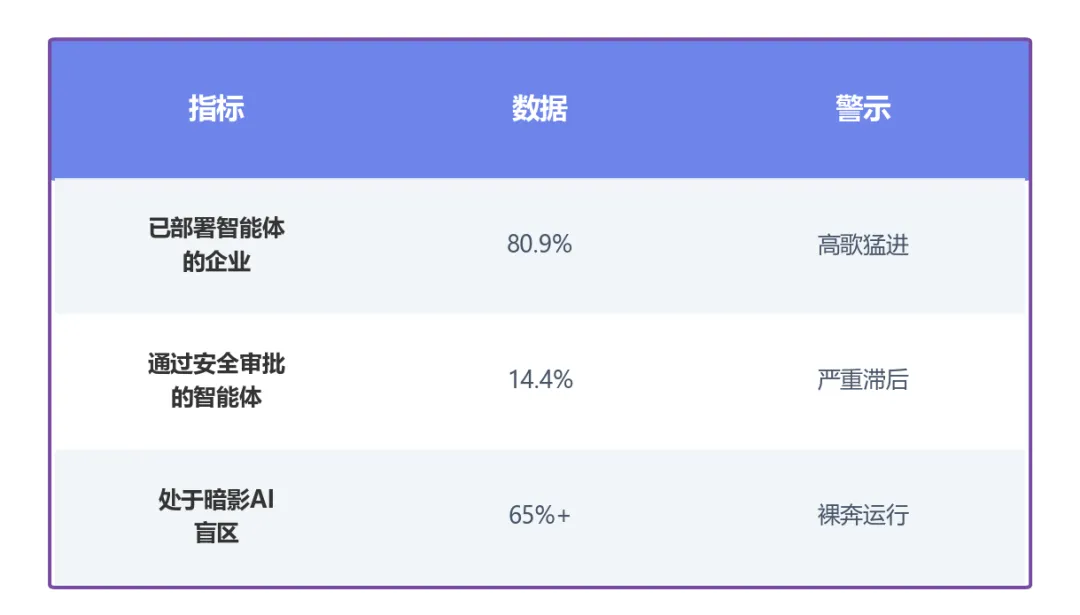 OpenClaw事件揭示了一个残酷事实:80.9%的企业已部署AI智能体,但仅14.4%通过安全审批。超过半数的AI自动化决策在"暗影AI"黑盒中裸奔运行。