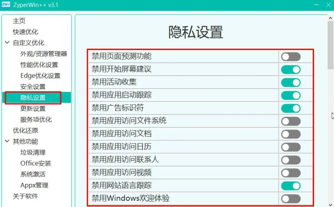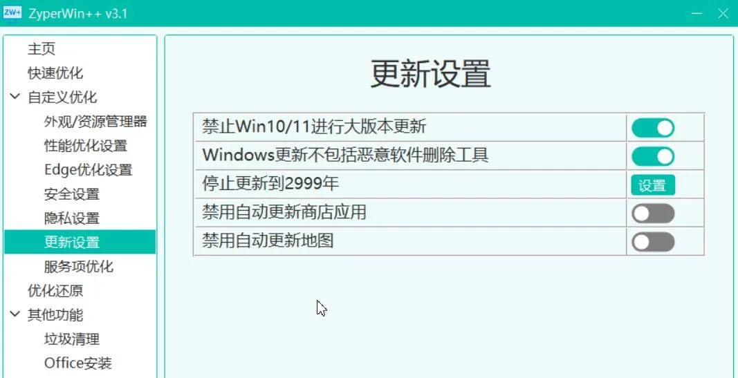 隐私与更新策略:ZyperWin++允许你轻松调整隐私设置和系统更新策略。 你可以根据自己对隐私和安全的需求,选择最适合的设置方案