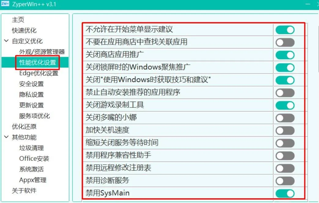 一键优化功能:ZyperWin++提供三种优化梯度:基本优化、深度优化和极限优化。 基本优化适合日常使用,深度优化则极致压榨性能,彻底关闭了一些安全组件,极限优化则提供了最大程度的性能释放。
