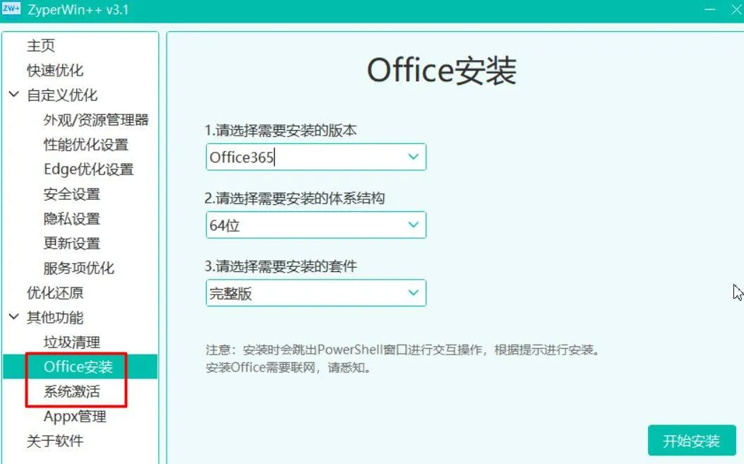 Office一键安装与系统激活:除了优化功能,软件还集成了Office一键安装与HWID/KMS等多模式系统激活入口。 简化了软件安装和激活的复杂流程,让你在重新安装系统后能快速配置好常用软件