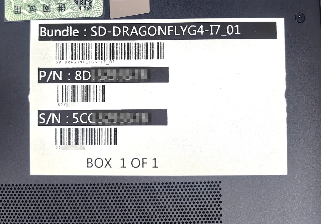 最简单的方法,一般来说我们可以在笔记本电脑D壳的标签上直接进行查看,S/N就是产品序列号,P/N就是产品编号。
