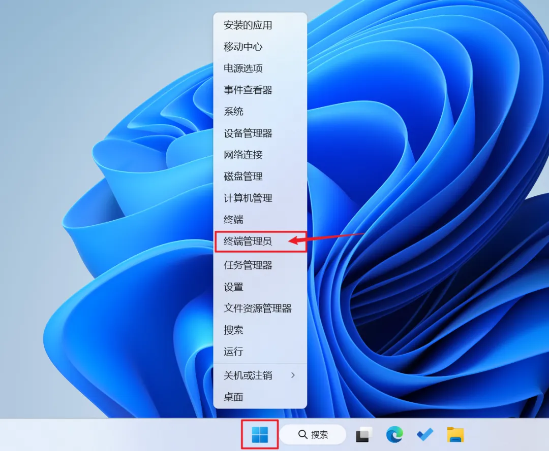 首先将鼠标放在任务栏的 Windows 图标上,右键单击,找到【终端管理员】并打开。