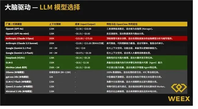 WEEX Labs经过多轮实战测试后发现:组建AI团队,“全员名牌”不等于最高效率。在Multi-Agent架构中,根据不同角色的职能属性,搭配适配的模型“混搭组队”,才是平衡性能与成本的最优解。