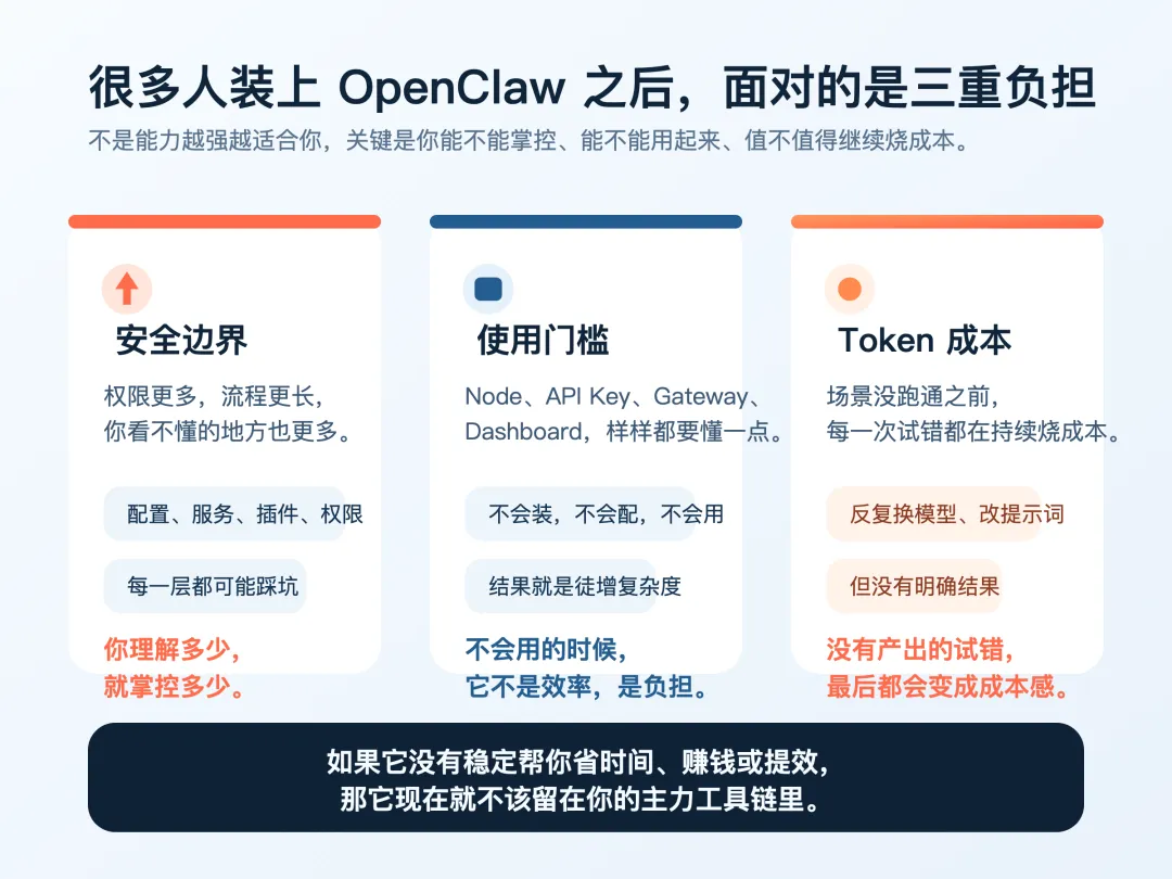 这不是说 OpenClaw 一定没价值。恰恰相反,越是这类能力很强、权限很重、可扩展性很高的工具,越不适合“先装了再说”。你没有明确场景,它就不是生产力工具,而是新的认知负担。