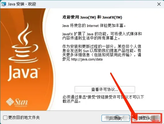 3,一直点击【下一步】或者【Next】,出现Java安装界面的时候点击【接受】。