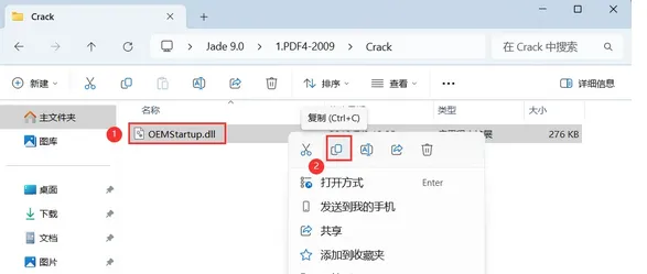 5,回到之前打开的文件夹【1.PDF4-2009】,找到【Crack】文件夹,打开它,复制里面的【OEMStartup.dll】文件。