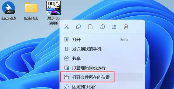 6,在桌面找到【PDF-4+2009】软件图标,点击【打开文件所在的位置】。
