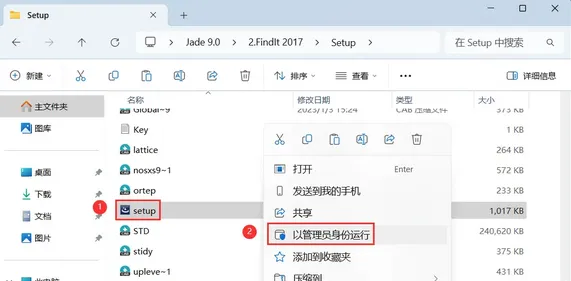15,回到开始解压的文件夹,依次打开【2.Findlt 2017】文件夹,【Setup】文件夹,然后找到【setup】应用程序,右键选择【以管理员身份运行】。