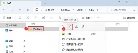 28,回到最开始解压的文件夹,依次打开【3.Jade9.0】文件夹,【Crack】文件夹,【64位】文件夹,右键【打开】它,复制里面的Windows文件夹。