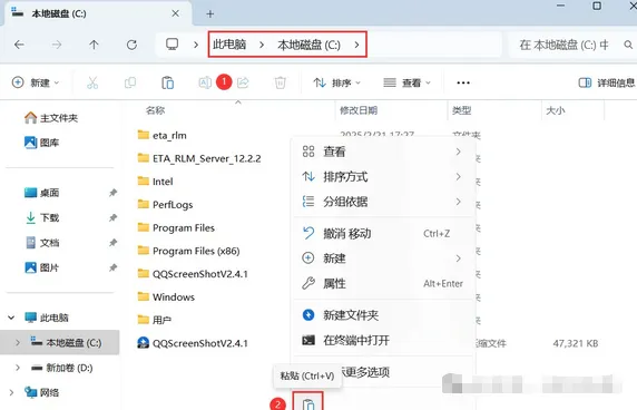 29,打开本地C盘,右键文件夹的空白处,点击【粘贴按钮】。