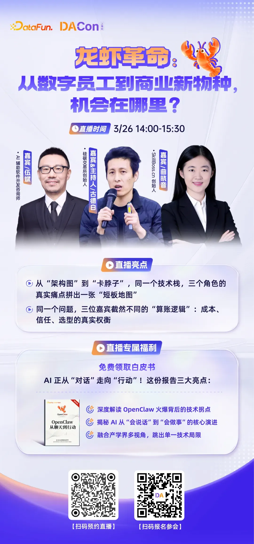 于是,我们做了一件事:把这三个切面的实践者,同时请到了同一张对话桌前轻松地聊天,时间是3月26日下午14:00-15:30,在线直播,直播主题:龙虾革命——从数字员工到商业新物种。