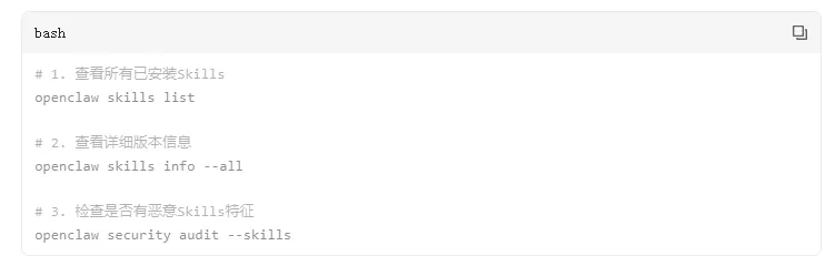 检查是否有恶意 Skills 特征: openclaw security audit -- skills