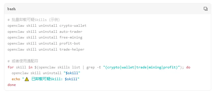 for skill in $( openclaw skills list | grep - E 「( crypto | wallet | trade | mining | profit )」); do openclaw skill uninstall 「$ skill 」; echo 「⚠️ 已卸载可疑 Skill :$ skill 」; done