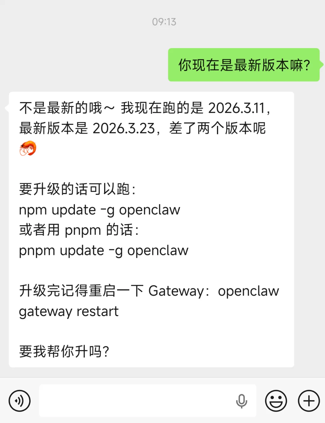 1.最简单的,直接和你龙虾对话,问它 有没有版本更新/查一下最新版本类似对话,他会提示你要不要升级