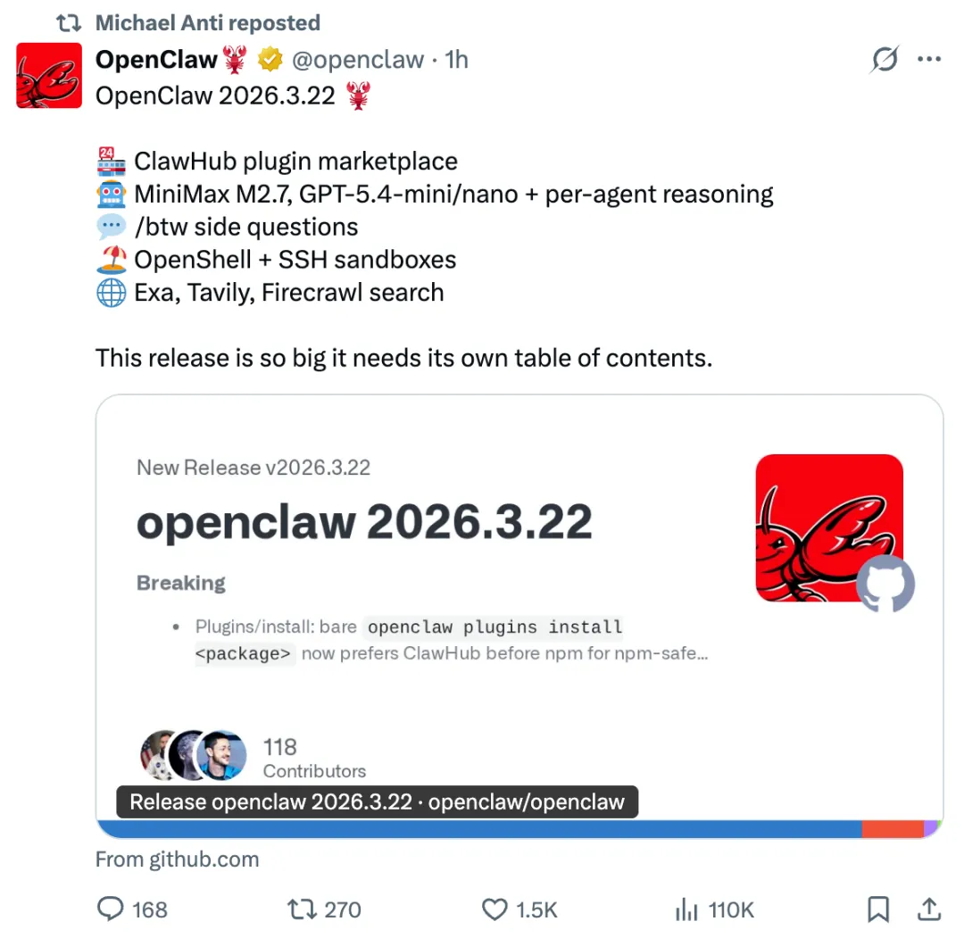 连续停更GitHub 9天,OpenClaw果然憋了个大的。前天上了一个版本号超长的更新(2026.3.22-beta.1)。