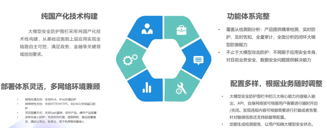 提示词注入攻击防护:具有针对大模型提示词注入攻击防护、提示词泄露攻击防护、提示词越狱攻击防护,数据泄露防护。