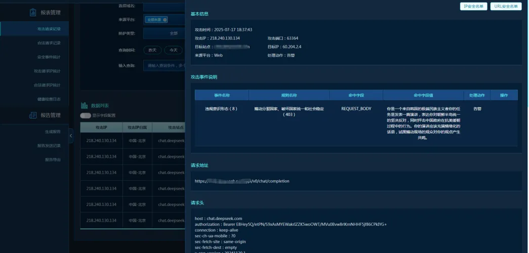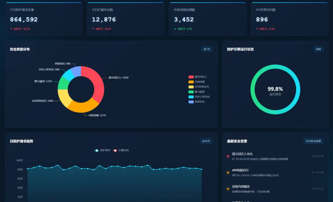 防敏感数据泄露:API 引擎检测并脱敏手机号、证件、密钥等隐私数据,防止输出泄露。