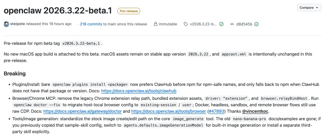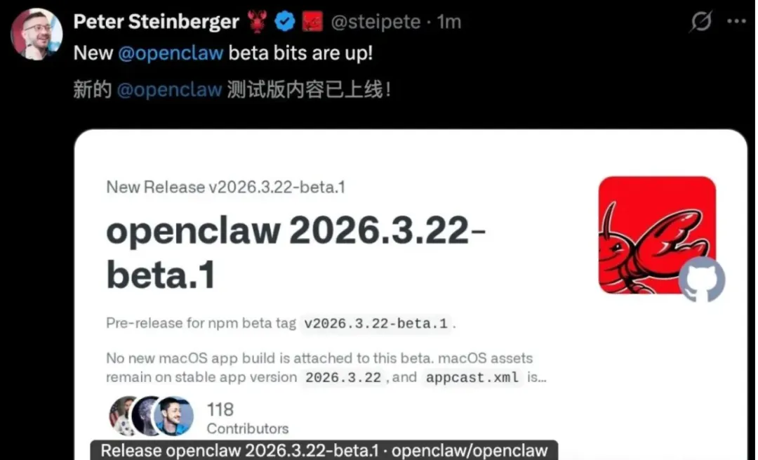 GitHub 上的 OpenClaw 停更 9 天,终于在 2026.3.22 迎来大动作!Peter Steinberger 正式官宣——OpenClaw 「3.22-beta.1」预览版上线!