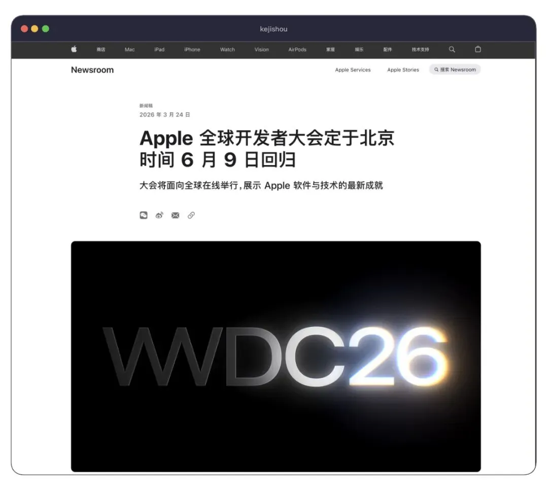 今天凌晨苹果通过新闻稿正式官宣,WWDC26(Apple 全球开发者大会)将于北京时间 6 月 9 日举行,苹果表示 WWDC26 将聚焦各大平台的最新进展,包括 AI 能力升级以及一系列全新的软件与开发者工具。