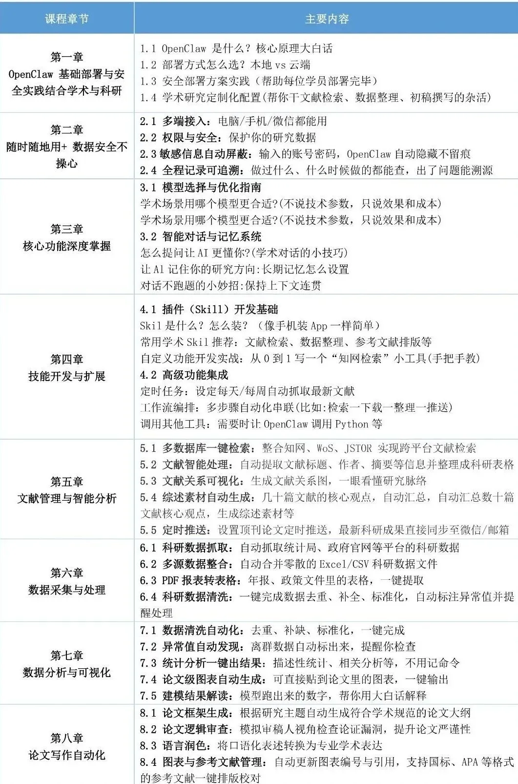 本培训由国内顶尖高校博导主讲,采用“理论讲解+实操演练”模式,确保学员能快速上手,学完即可独立运用OpenClaw提升科研效率。课程内容见下图: